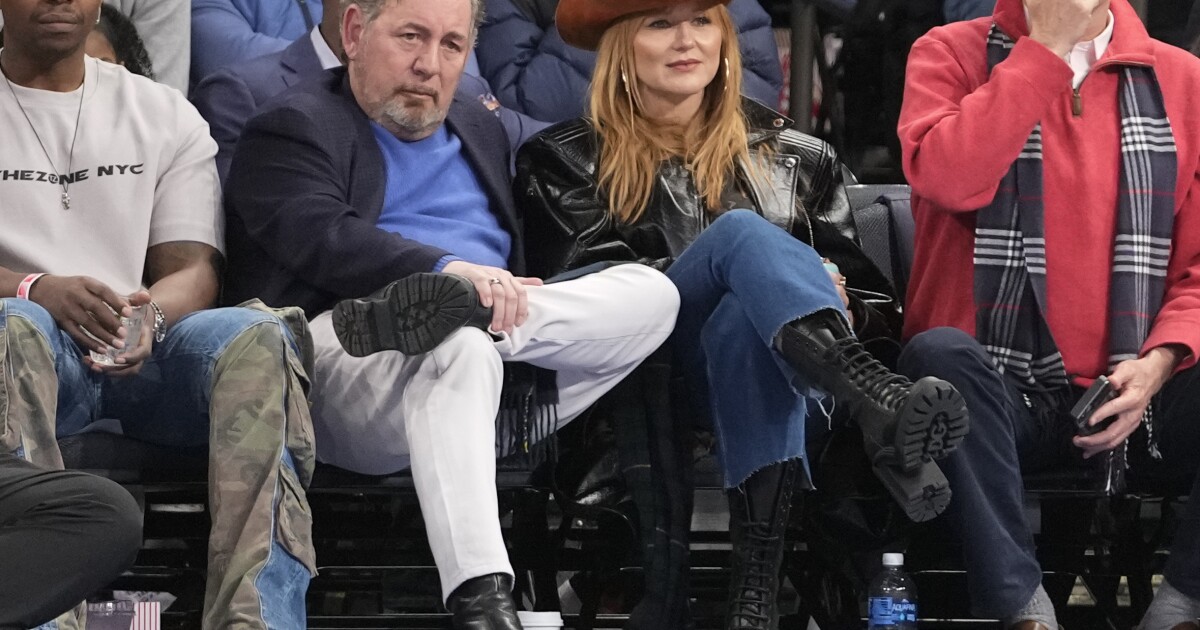 New York Knicks owner James Dolan, left, and the singer-songwriter during the second half of an NBA basketball game between the New York Knicks and the New Orleans Pelicans at Madison Square Garden on Saturday, Feb. 25, 2023 in New York. Jewell. The Knicks won 128-106. (AP Photo/Mary Altaver)