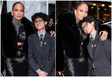 The mother-daughter duo exuded charm and elegance as they posed for photographs, with Lopez donning a stunning floor-length gown that shimmered under the camera flashes. The dress, designed by a renowned luxury fashion house, featured intricate embellishments and a sophisticated silhouette that perfectly complemented her radiant beauty. She accessorized with diamond earrings and a chic updo, allowing her natural glow to take center stage. Emme, on the other hand, opted for a stylish yet understated look, showcasing their unique personality and fashion sense. The teenager, who has already become a figure of interest due to their musical talent and association with two of the industry’s biggest stars, confidently walked beside their mother, exuding poise and grace.