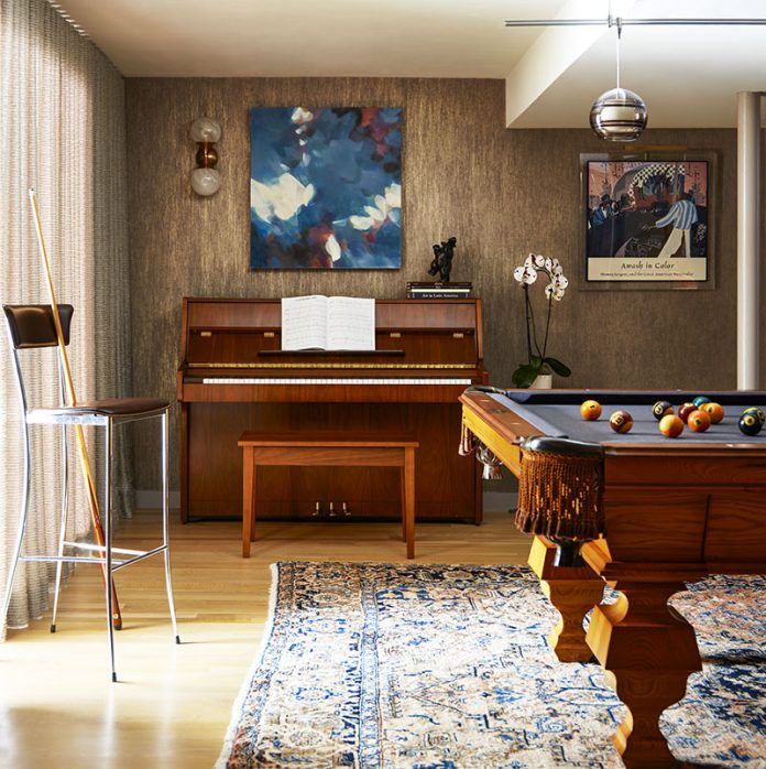 With homeowners in Lincoln, MA awaiting COVID in Carmel, CA, Sullivan thinks now is a good time to do more with the space. “It’s very humble,” says the Boston-based designer. “There’s no color on the walls, just a few simply framed jazz posters.” These posters, along with a piano, pool table and Zoltan’s wine collection, served as inspiration for Sullivan. The bottles are kept in a closet with makeshift shelves that are in great need of an upgrade. “I suggested creating a jazz-themed rec room,” says Sullivan.